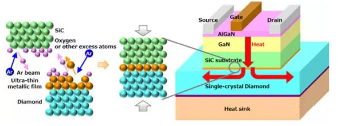 Single-crystal diamond has extremely good thermal conductivity-almost five times that of a SiC substrate-and is known as a material that can efficiently spread heat. In order to bond a single-crystal diamond to a device as a cooling material, normal production processes use an Ar beam to remove impurities, which produces a low-density damaged surface that weakens the bonds the single-crystal diamond can form. Moreover, using SiN or other insulating films for bonding interferes with thermal conductivity due to SiN’s thermal resistance.